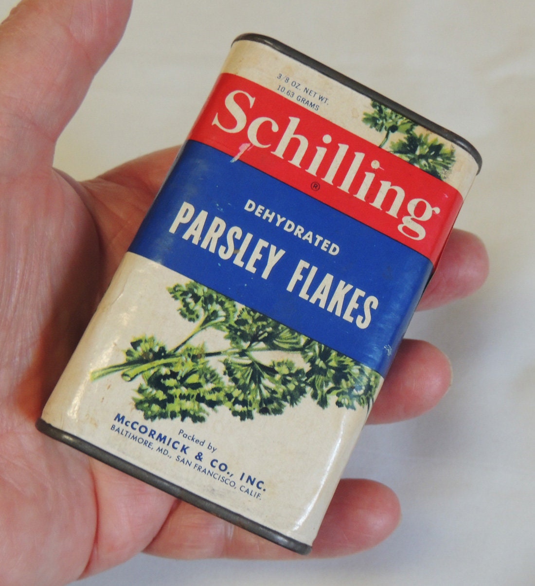 A rare Schilling Parsley Flakes mid century spice tine with some contents. It is in good condition with minor wear and patina consistent with age and normal use (see photos).