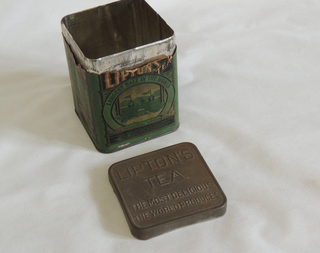 This antique tea tin measures approximately 3.25" x 3.25" x 4". The Lipton Green Tea label has some wear but is mostly in tact with reasonably good graphics (see photos). Please see photos for more information and view actual condition. We believe this tin was produced around 1915 - 1920 as the label mentions awards in 1904 and (see photos).