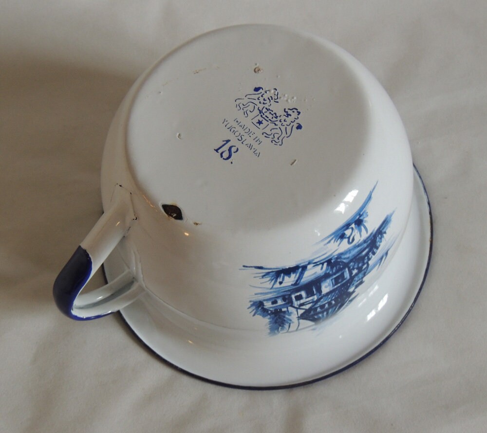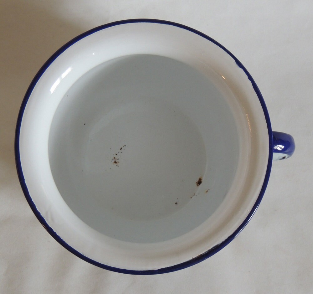 Vintage enamelware child's potty chamber pot with handle marked "MADE IN YUGOSLAVIA". It is white with cobalt blue trim and a blue windmill decoration. There are a couple of small worn spots on inside bottom (see photos). Otherwise it is in very good, vintage preowned condition. Unique and adorable (see photos).