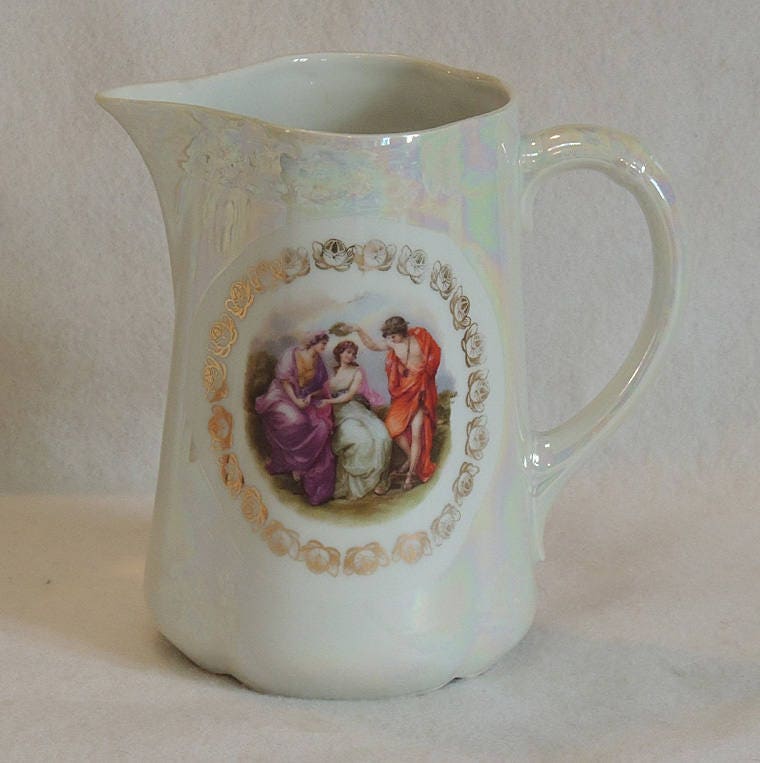 A beautiful estate find! This antique pitcher is approximately 7.5" tall and 4" in diameter at the top. It features an iridescent pearlized glaze. On the front is a colorful image of three Greek figures framed with a gold wreath. The only mark is the number "31" in gold on the bottom. It is in good vintage pre-owned condition with no chips, cracks or crazing (see photos).