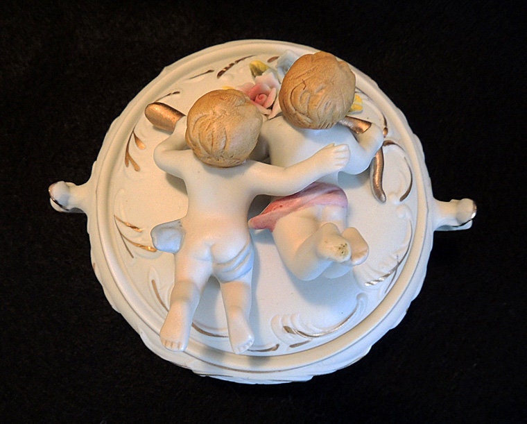 Vintage Bisque Porcelain Putti Twins Covered Bowl.. Hand Painted Cupid Dish