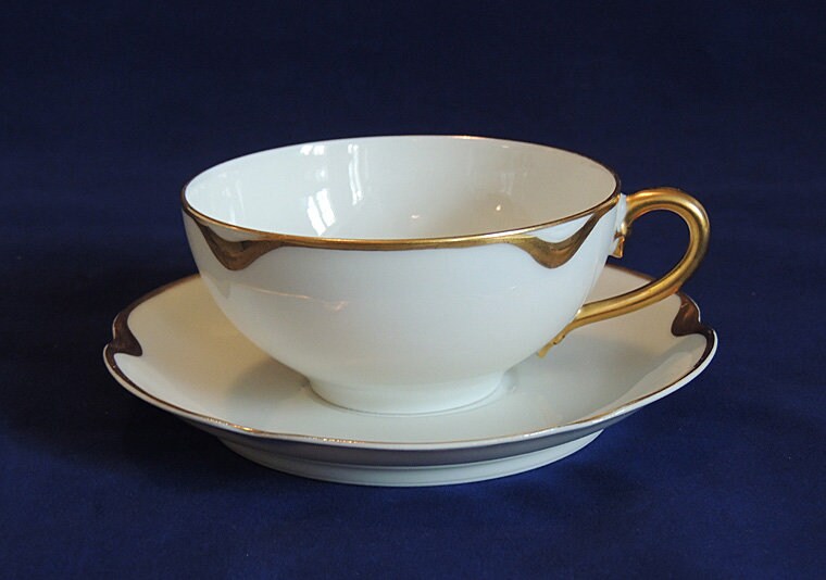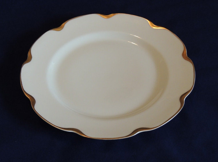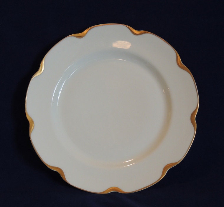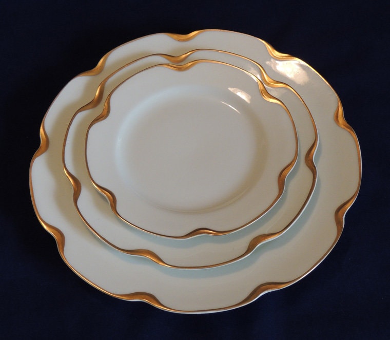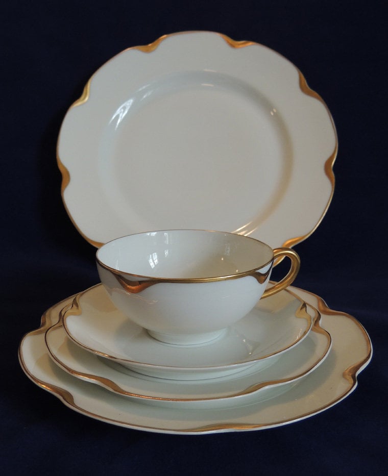 This listing is for one five piece place setting in Haviland Limoges "Silver Anniversary" pattern (also known as "Schleiger 19" pattern). The pieces are beautiful white porcelain with a scalloped shape edge and heavy gold trim. The following individual pieces are included: