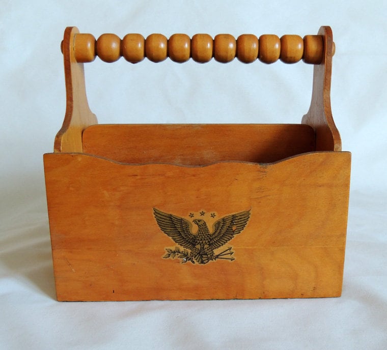 A vintage wooden caddy that measures approximately 8.5" x 8" x 5". It has a vegetable decal on one side and an eagle on the other (see photos). There are partitions inside and a spool style handle (see photos). There are two main partitions and one of the partitioned sides has a divider that divides it further. There are slots on this side for two additional dividers, but these additional dividers were lost over the years and are not included. The piece has some surface wear (including wear to the decals) but overall it is a solid piece in good, vintage pre-owned used condition (see photos).